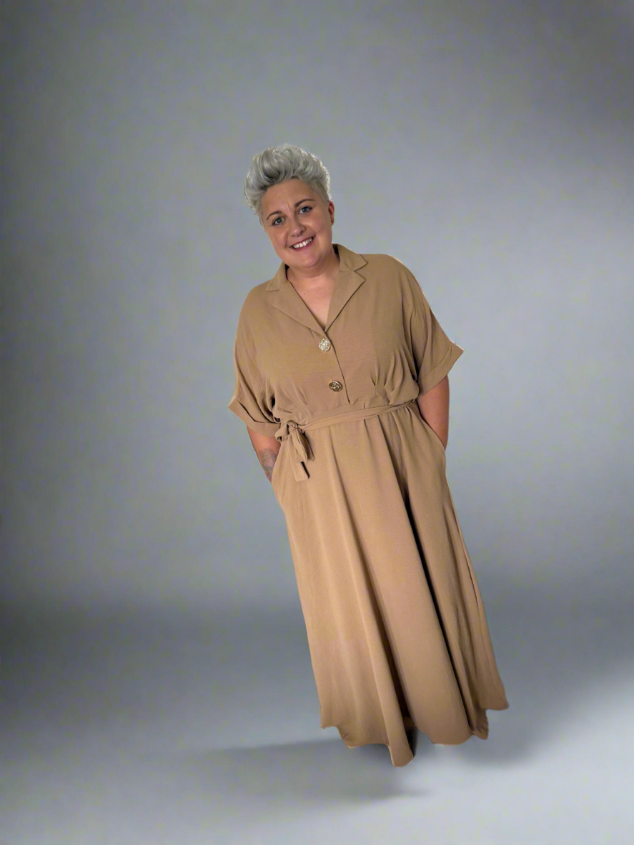 The Ophelia collared Maxi Dress is designed to flatter your figure with its versatile cut and soft, breathable fabric. Featuring gold button detail, a collared neckline, pockets and a detachable belt, this dress can be dressed up or down for any occasion. Plus, it's timeless and never goes out of style. Perfect for work, coffee with friends, evenings out, or holidays. Get ready to feel confident and stylish in this must-have dress.