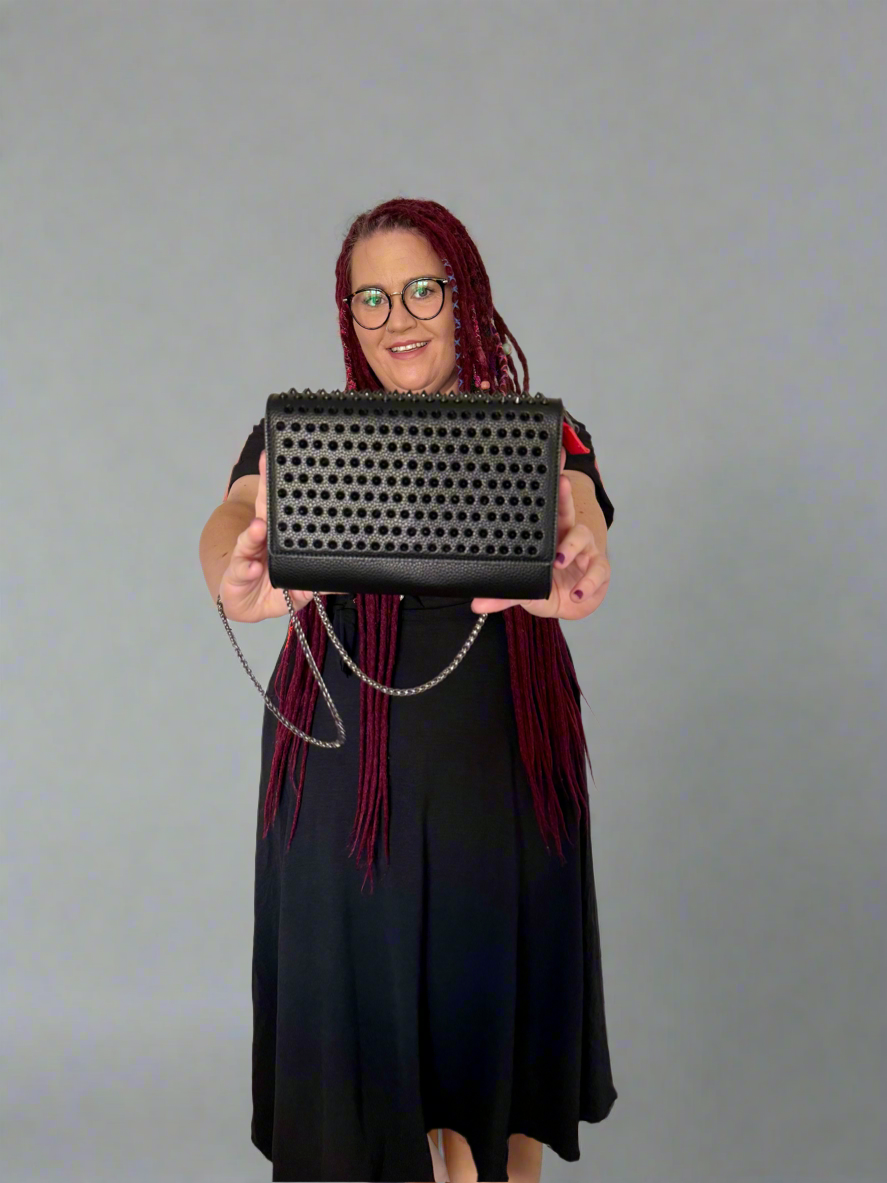 Introducing the Genevieve Stud Clutch Bag, your go-to evening accessory. With a striking red side detail, black stud frontage, this bag adds an elegant touch to any outfit. The silver zip fastening and removable chain offer convenience and versatility for any occasion. Elevate your style with this must-have clutch. Perfectly paired with our small gold hardware purse to keep all your belongings safe.